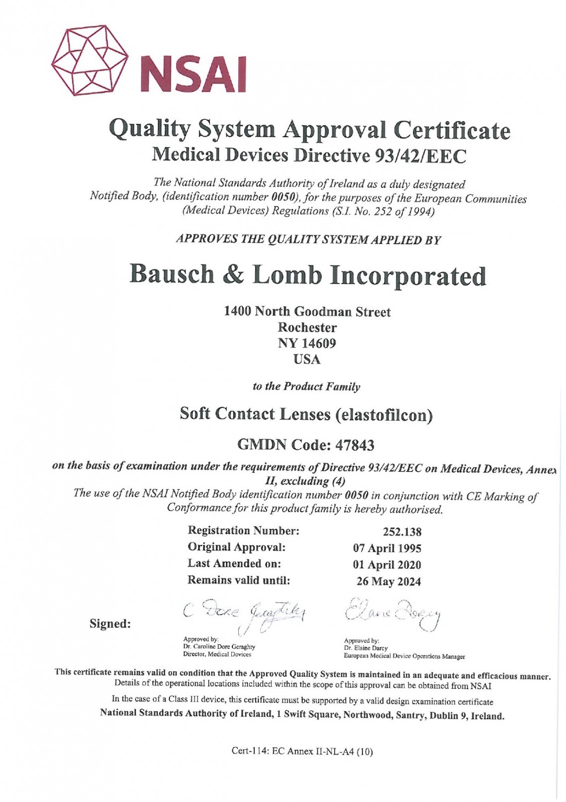 Bausch&Lomb Kvalitātes sistēmas apliecinājums