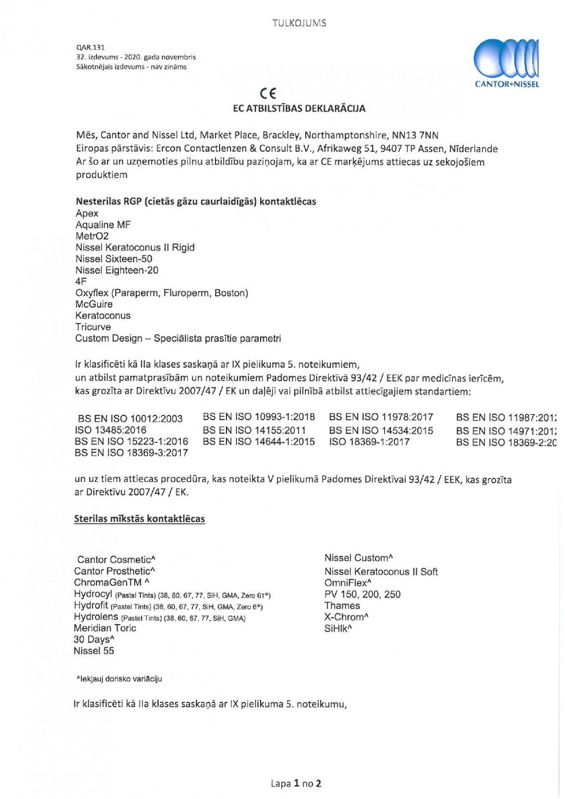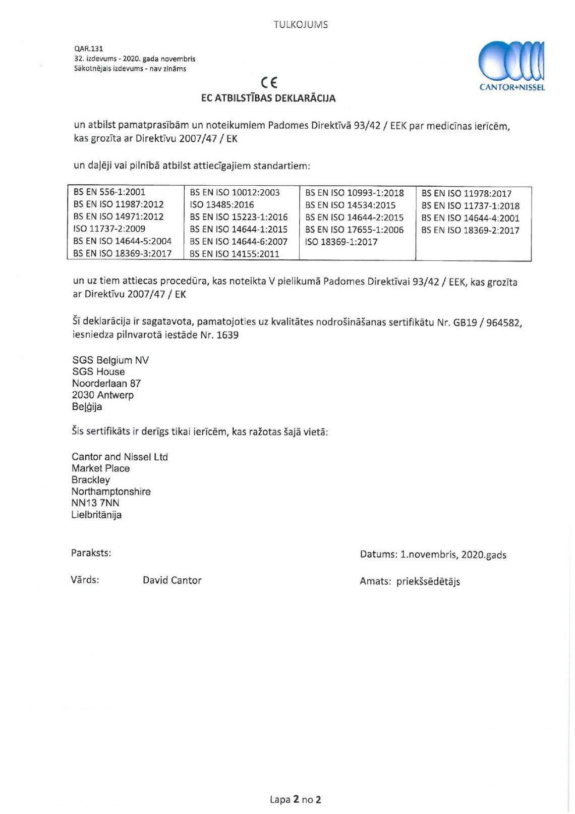 Cantor+Nissel EC atbilstības deklarācija