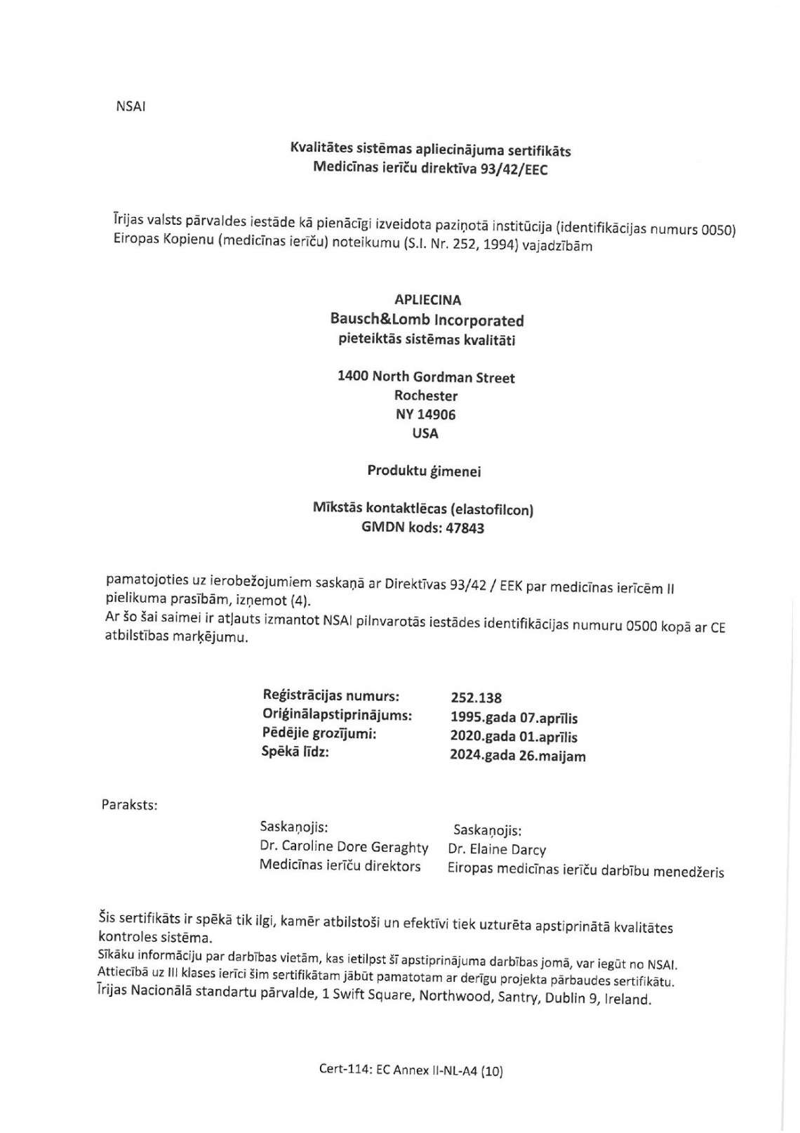 Bausch&Lomb Kvalitātes sistēmas apliecinājums